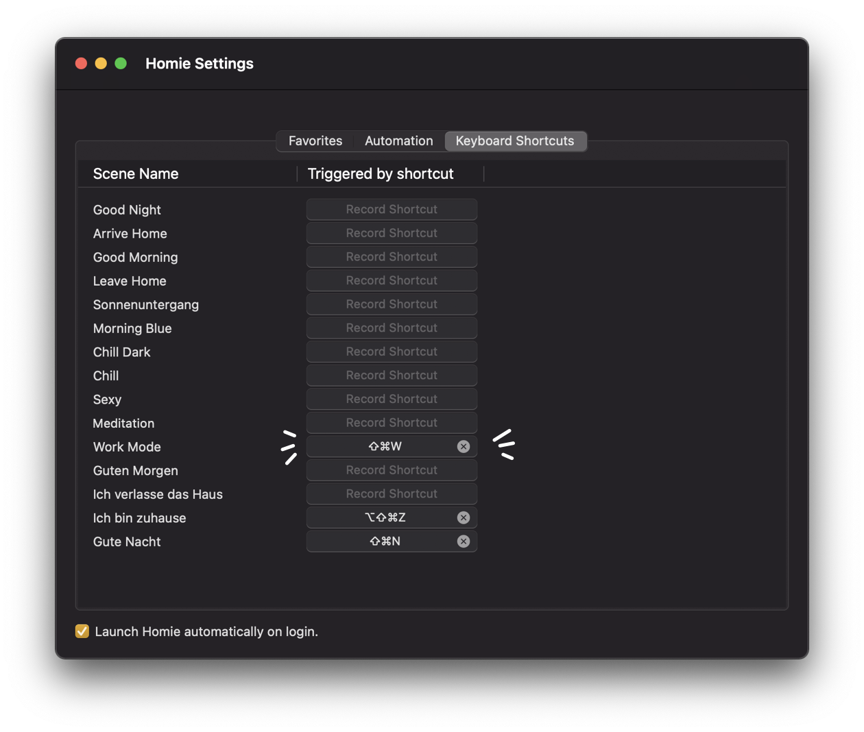To solve this, I’ve built a little app for Big Sur that lives in the macOS menu bar. Super-fast to access for quick scene switching. But that’s not where I stopped: On top of that I’ve added support for global keyboard shortcuts to enable scenes and automation support to trigger certain scenes automatically, e.g. when the computer is locked or wakes up from sleep.